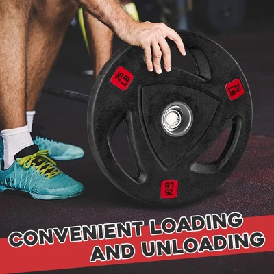 - UNIQUE GRIP DESIGN – Each rubber weight plates has 3 large openings, easier grip to carry and loading & unloading, labeled in LB on the surface for fast recognition.