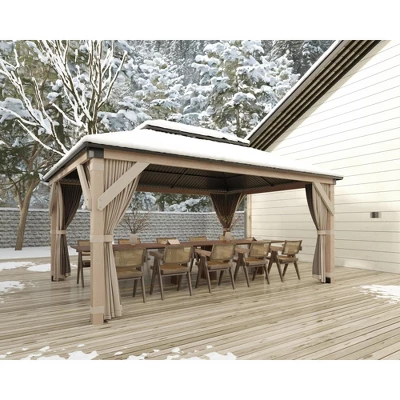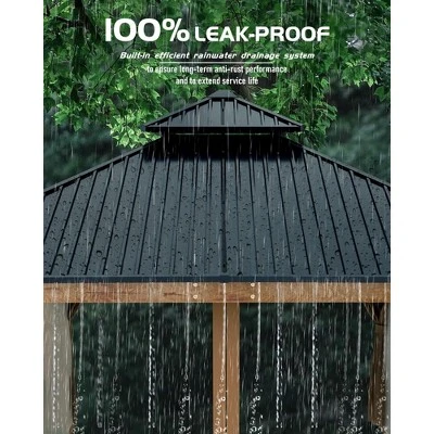 12×12 FT Wooden Gazebo with Double Steel Roof ¨C Outdoor Hardtop Gazebo for Backyard, Patio & GardenProduct Highlights:? Premium Upgraded Wooden Frame ¨C Treated, weather-resistant wood construction prevents rot and insect damage for long-lasting durability in all seasons.? Double-Layer Galvanized Steel Roof ¨C Provides 100% waterproof protection, blocks UV rays, and enhances wind resistance for reliable shelter.? Spacious 12×12 FT Design ¨C Generous 144 sq ft interior fits outdoor furniture, BBQs, or gatherings with family and friends.? Built-In Privacy & Bug Protection ¨C Includes integrated netting + adjustable curtains for airflow, shade, and insect-free relaxation.? Easy Assembly & Low Maintenance ¨C Comes with pre-cut wood, steel roofing panels, and all hardware for straightforward setup.Specifications: